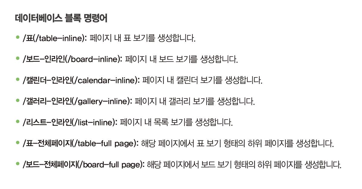 한국어판의 대표적인 변경 사항 중 하나는 슬래시(/) 명령어입니다. 노션에 익숙한 사용자라면 메뉴 아이콘을 눌러 일일이 원하는 명령을 찾아 쓰는 대신 슬래시와 함께 원하는 명령어 몇 글자만 입력하는 방식이 손에 익었을 거예요.