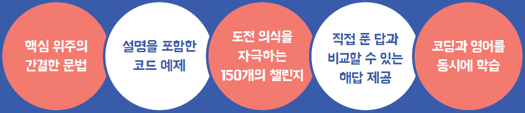 150개의 코딩 과제를 주제별로 23개의 챌린지 그룹으로 묶었고, 각 챌린지 그룹은 해당 주제에 대한 문법 설명을 간략하게 먼저 언급합니다. 그리고 그 문법에 관한 간단한 예제 코드를 보여주고, 스스로 해결해야 할 챌린지 문제들이 난도를 점차 높여가며 나옵니다. 이어서 저자가 제시하는 해답이 나오는데, 이 해답과 자신이 푼 해답을 비교해 보시면 됩니다. 해답 코드에서 텍스트는 모두 영어로 되어 있습니다. 한국어로 번역하여 제공할 수도 있었지만, 간단한 영작을 통해서 영어 공부에도 도움이 되었으면 합니다.
