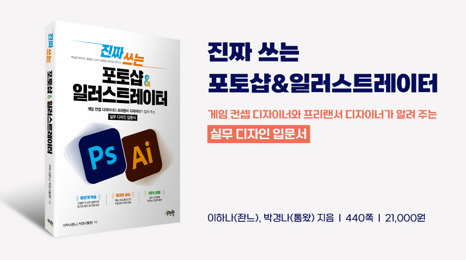 이 책, 《진짜 쓰는 포토샵 & 일러스트레이터》에서는 제목 그대로 실무에서 디자인 결과물을 완성하기 위해 '진짜 쓰는' 꼭 필요한 기능을 모았습니다. 불필요한 암기에 시간을 낭비하지 말고, 처음부터 제대로, 핵심 기능만 확실하게 익힌다면 여러분이 원하는 멋진 디자인 결과물을 완성하게 될 것입니다.