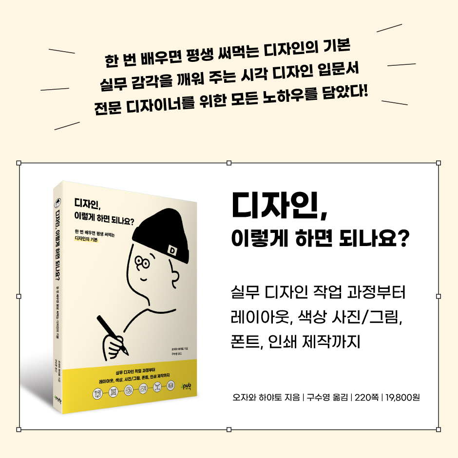 디자인이 무엇인지 그 본질을 이해하느냐에 따라 디자이너가 창출할 수 있는 디자인의 폭이 크게 달라집니다. 대체로 신입 디자이너는 기억할 것이 산더미처럼 많아 그때그때 익히기 바빠요. 그래서 별다른 고민을 하지 않더라도 실무에서 부딪혀 가며 성장하게 됩니다.하지만 어느 정도 수준에 도달한 후부터는 디자이너 스스로 자신을 성장시킬 수 있도록 자신의 기본기를 점검할 필요가 있습니다.