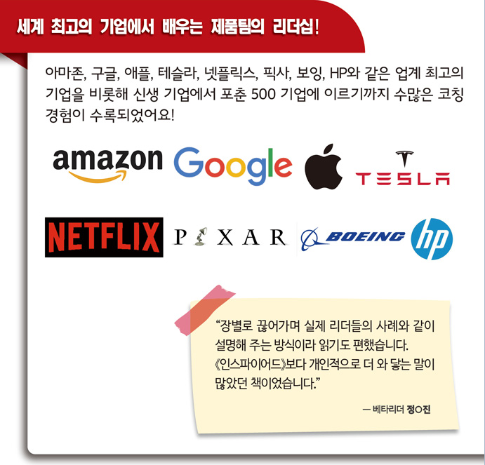 《인스파이어드(전면개정판)》가 세계적인 제품은 어떻게 만들어지는지를 주로 다뤘다면, 이번 《임파워드》는 프로덕트 매니저(제품 관리자)는 물론 프로덕트 디자이너, 엔지니어가 합심해서 놀라운 성과를 만들어 나가는 방법과 함께 리더가 나아가야 할 방향을 제시하고 있습니다. 스타트업의 대표나 IT 기업의 CEO가 함께 읽는다면 회사의 밝은 미래가 더 빨리 오지 않을까 싶습니다. ㅎㅎ