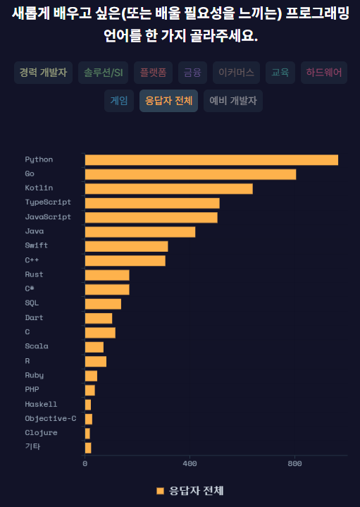 다음은 1년 전 자료이긴 합니다만, 프로그래머스에서 국내 개발자들을 대상으로 한 설문조사 중 하나인데, 배우고 싶은 언어 2위에 Go가 랭크되기도 했습니다.