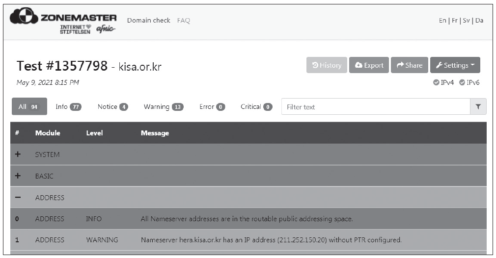 203쪽 그림 8-12 'Zonemaster로 kisa.or.kr을 체크한 화면'을 다음 그림으로 변경