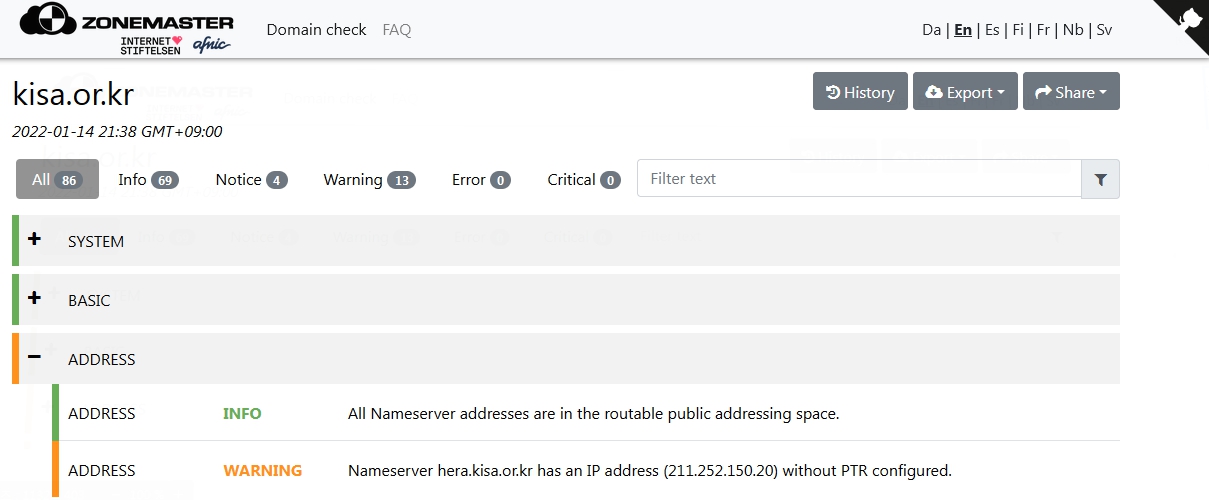 체크 결과는 대상 도메인 이름의 상태에 따라 파랑(Info), 노랑(Notice), 주황(Warning), 빨강(Error, Critical)의 총 네 가지 색으로 구분됩니다. 파랑이 아니더라도