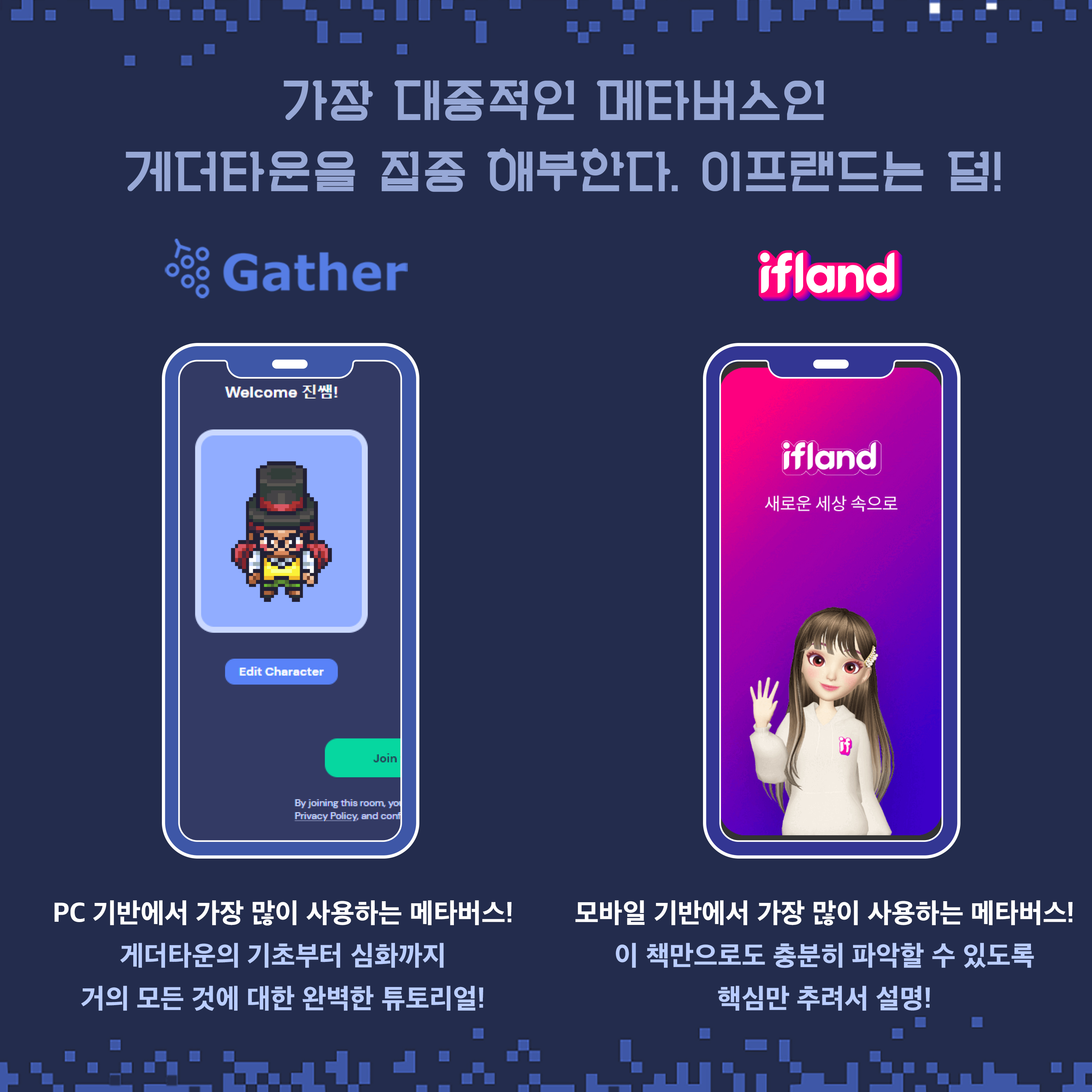 새로운 시대에 걸맞은, 강력한 가상 현실 세계가 생겨났습니다. 바로 PC 기반에서 가장 많이 사용하는 게더타운과 모바일 기반에서 가장 많이 사용하는 이프랜드입니다(우리나라 기준입니다).
