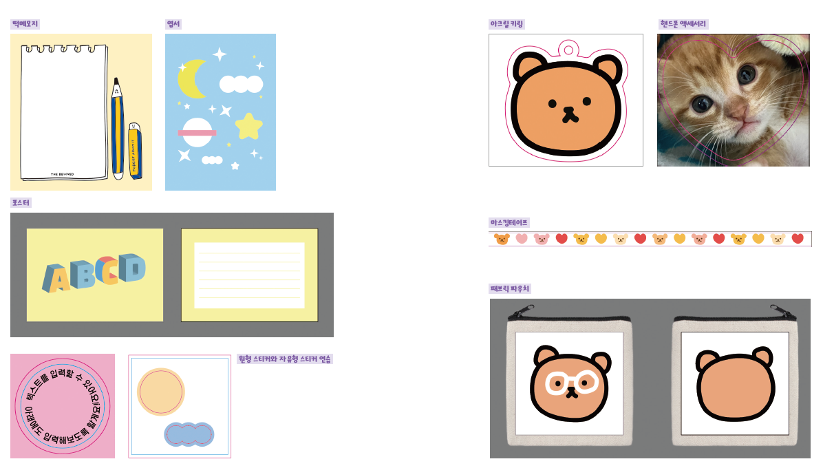 대부분의 굿즈 제작 업체에서 일러스트레이터 파일로 굿즈 템플릿을 제공하므로, 원하는 굿즈를 좀 더 편리하게 만들고, 완성도를 높이기 위해서는 일러스트레이터 사용이 필수랍니다.