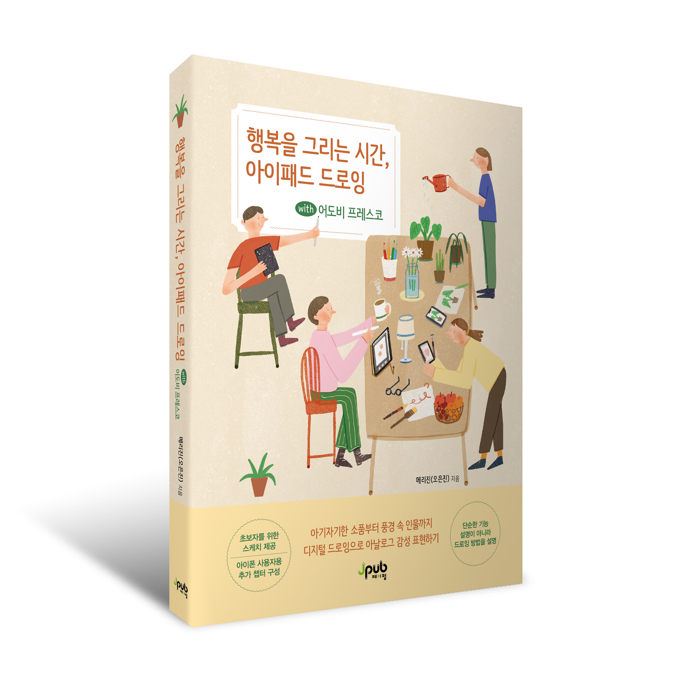 무료 드로잉 및 페인팅 앱 어도비 프레스코(Adobe Fresco)는 다양한 장점이 있지만, 특히 아날로그 감성의 브러시 구현이 생생하다. 이 책의 드로잉은 복잡한 기능과 화려한 기술을 요구하지 않으며 무료 애플리케이션 어도비 프레스코를 사용한다. 또한 메리진 작가는 그림 그리기 본질에 집중할 수 있도록 정말로 유용한 기능만을 실제 자신의 그리기 과정을 낱낱이 보여주며 자연스레 설명한다. 유명한 드로잉 애플리케이션을 다운로드했지만, 막상 실행하니 이것저것 설정값을 익히다가 지친 적이 있다면, 그리기 본연에 충실한 메리진 작가와 함께 일상에서 발견하는 행복한 순간을 기록해 보자.