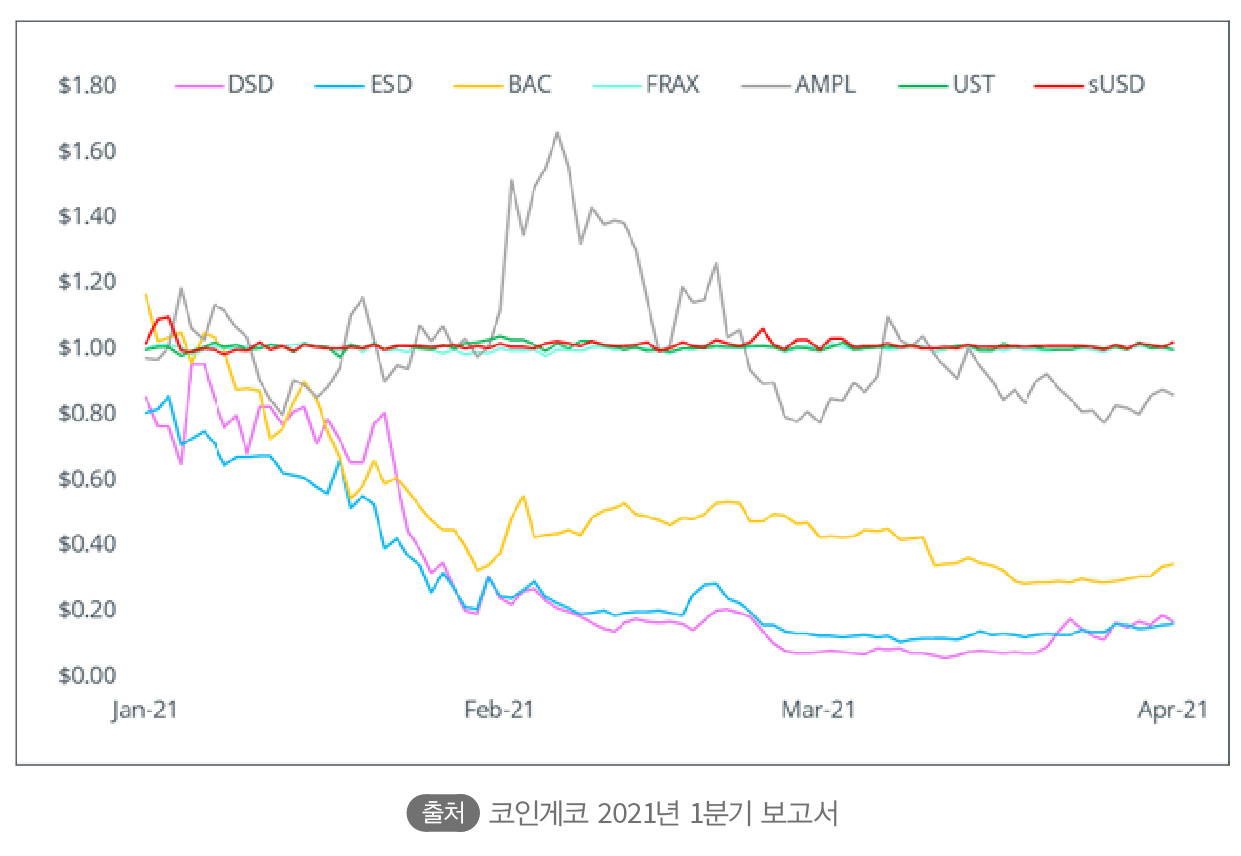 글로벌 시가총액 6위까지 기록했던 테라 블록체인의 루나(LUNA) 코인이 주요 거래소에서 상장폐지되는 초유의 사건이 발생했습니다. 일주일 만에 -99.9999%를 기록한 이번 사태로 스테이블코인과 디파이에 대한 규제가 심해질 것이라는 전망도 나오고 있습니다. 사실 ‘알고리즘 스테이블코인’은 2020년 말부터 여럿 출시되었지만 페깅(pegging, 가치 고정)을 유지한 코인은 얼마 되지 않았습니다.