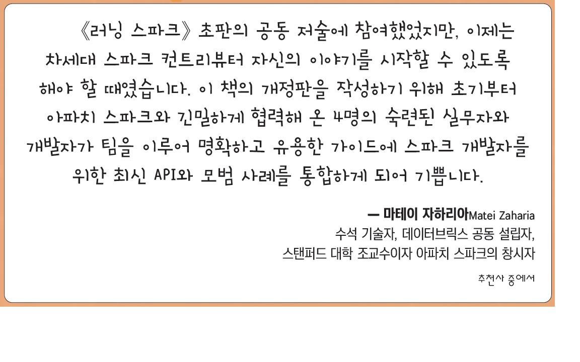 이 스파크 창시자 '마테이 자하리아'가 공저자로 참여했던 《러닝 스파크: 번개같이 빠른 데이터 분석》의 제2판이 곧 출간될 예정인데요, 이 개정판에서 자하리아는 다음과 같이 말하며 추천하고 있습니다.