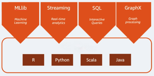R, 파이썬, 스칼라, 자바 등의 다양한 언어를 지원하며, 분산형 ANSI SQL 쿼리로 빠르게 사용할 수 있는 데이터 분석 라이브러리를 갖춰서 이들 언어와 데이터베이스에 대한 기본적인 이해가 있으면 쉽게 사용할 수 있다는 장점 등의 이유로 최근 들어 많은 곳에서 아파치 스파크(Apache Spark)를 이용하고 있습니다.