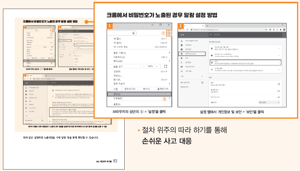 개인이나 기업이 당할 수 있는 해킹의 주요 기법 119가지를 선별한 후 각 기법의 개요와 증상, 그리고 예방 및 대처 방법을 400개 이상의 이미지와 130여 개의 손그림을 통해 보안에 관한 지식이 전혀 없는 사람 누구라도 해킹 사고나 IT 보안 관련 사고가 발생했을 때 참고하면서 사고에 대응할 수 있는 책을 만들었습니다.