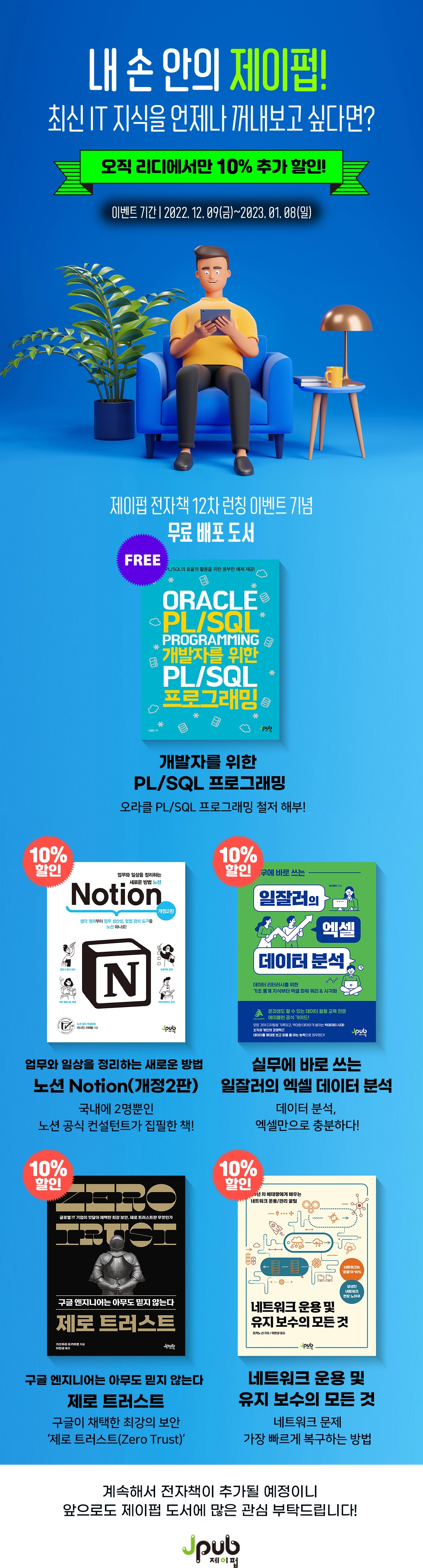 최신 IT 지식을 언제나 꺼내보고 싶다면? 내 손 안의 제이펍! 제이펍 e-book 12차 런칭! 1. <개발자를 위한 PL/SQL 프로그래밍> 무료 배포 2. 이벤트 도서 14종 리디 단독 소장 10% 할인
