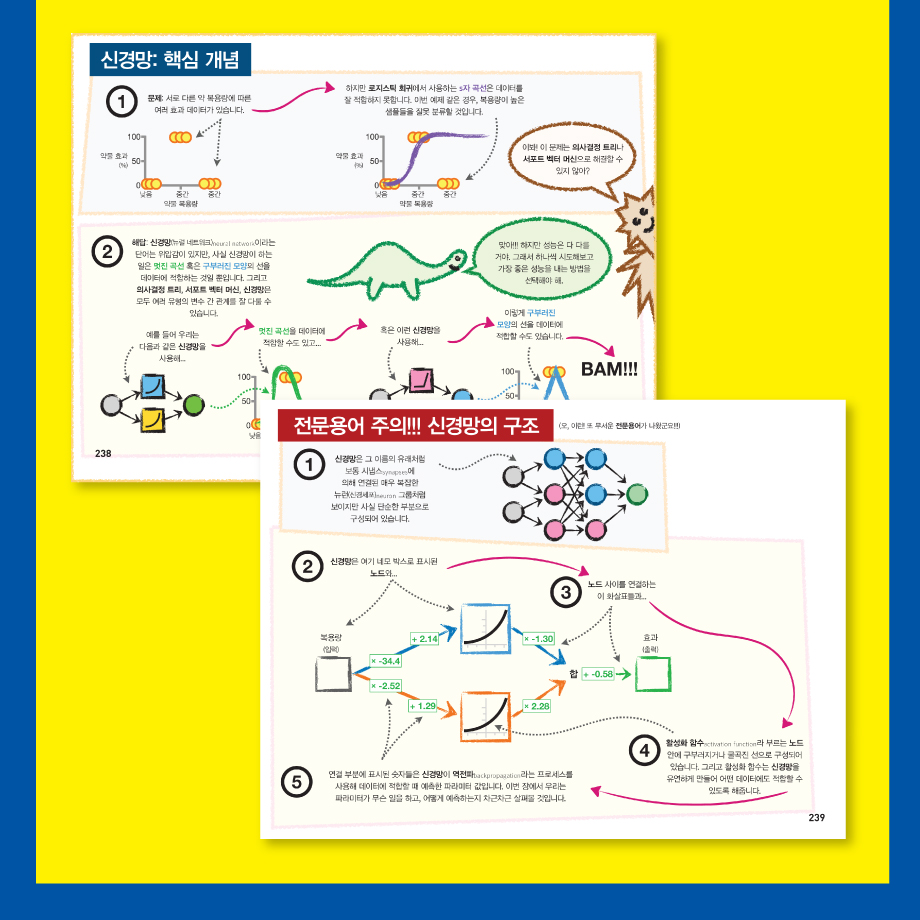 《그림으로 배우는 StatQuest 머신러닝 강의》 책 일부인데요, 노말사우르스(Normalsaurus), 스탯스콰치(StatSquatch)와 함께 화살표를 따라가며 그림으로 이해하는 방식이 바로 조시 스타머가 고안한 StatQuest 방식이에요.