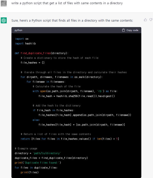 검색해보니 스택오버플로에는 더 긴 코드가 있긴 하네요(중복 파일을 찾아서 제거까지 하는 버전). https://stackoverflow.com/questions/748675/finding-duplicate-files-and-removing-them