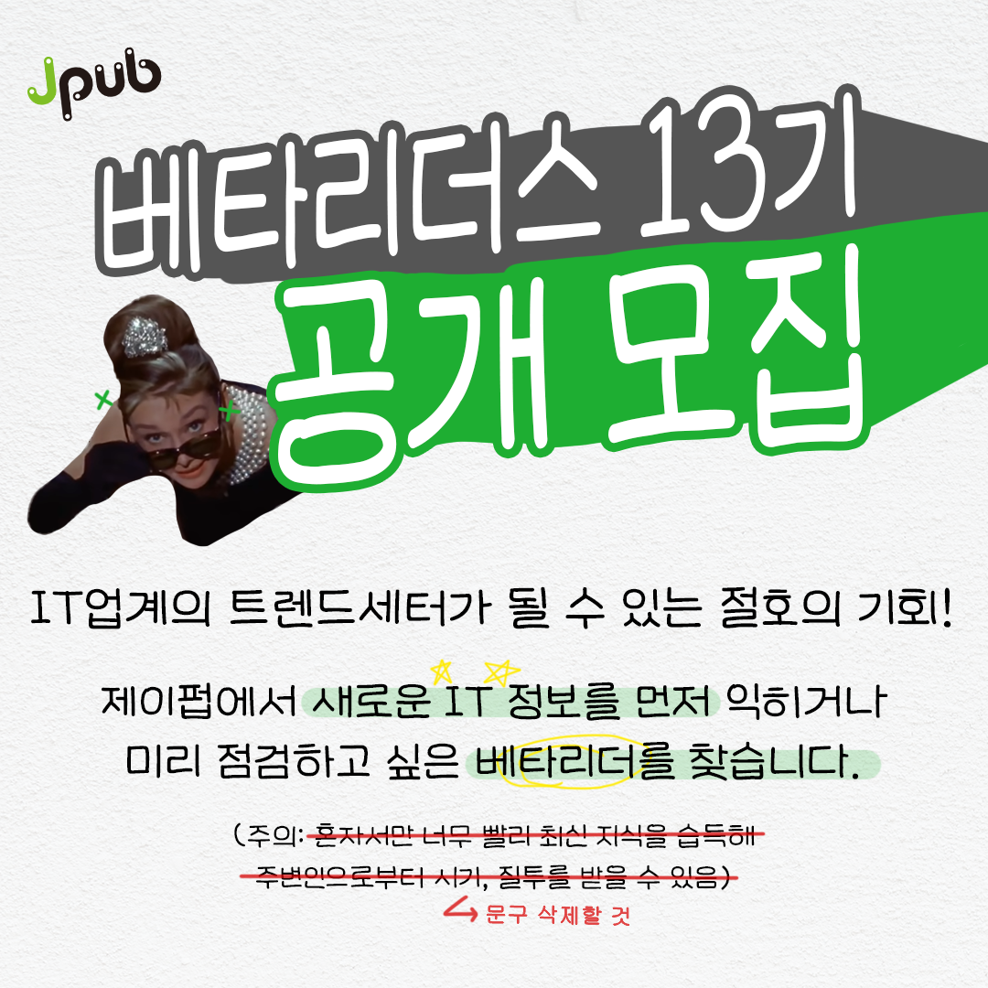 오늘은 제이펍 많은 분들이 문의주시고 기다리셨던 제이펍 베타리더스 13기 모집 소식을 전해드릴까 해요.
