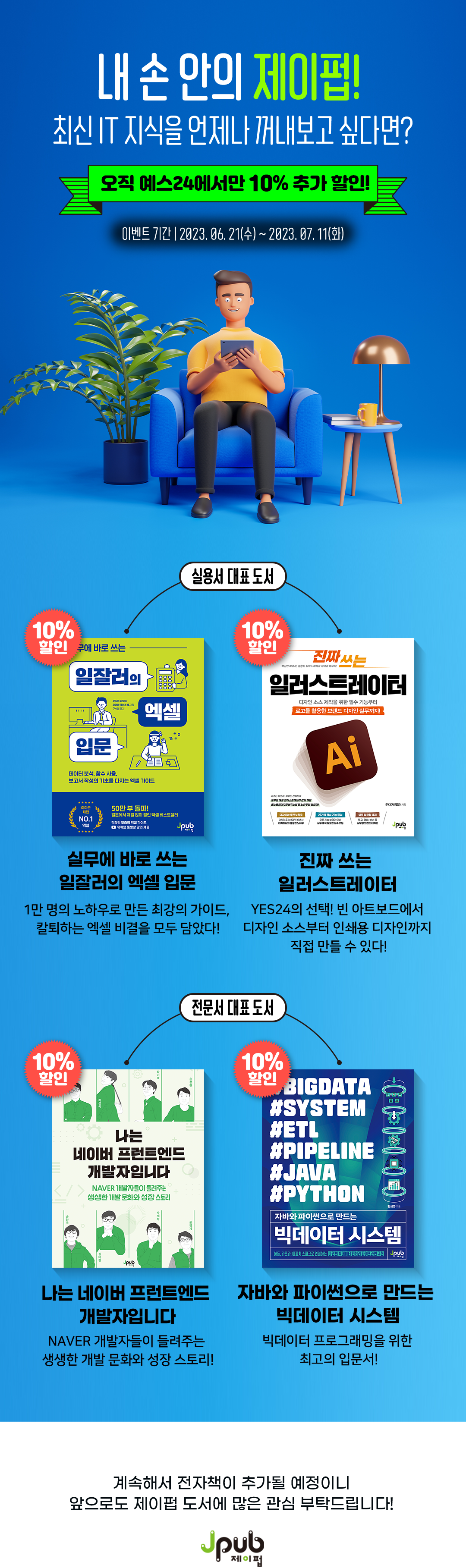 베스트셀러 엑셀 신간 《실무에 바로 쓰는 일잘러의 엑셀 입문》, 일러스트레이터 분야 1위 《진짜 쓰는 일러스트레이터》부터 많은 개발자의 사랑을 받고 있는 《나는 네이버 프런트엔드 개발자입니다》와 《자바와 파이썬으로 만드는 빅데이터 시스템》 등 제이펍이 자랑하는 12종의 도서를 신규 전자책(PDF 기반)으로 만나보실 수 있습니다.