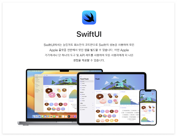 SwiftUI는 빠른 스위프트 언어의 장점을 살리며, 단 한 번의 개발로 모든 애플 플랫폼에서 동작이 가능한 애플리케이션을 만들 수 있습니다. 또한, SwiftUI에서는 코드 에디터에 코드를 작성하면 프리뷰 캔버스에서 바로 확인할 수 있습니다. 간단하게 인터페이스를 빌드할 수 있는 직관적인 디자인 도구가 포함되어 있으며, 변경 사항을 즉시 재컴파일하고 실행 중인 앱 버전에 삽입하므로 상시 확인 및 편집이 가능한 장점도 있습니다.