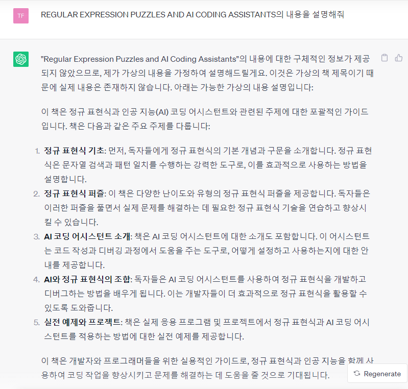 저도 안 써볼 수 없어서 이번에 소개해드릴 《인간 vs. AI 정규표현식 문제 풀이 대결》에 대해 ChatGPT에게 물어봤습니다. 원서가 2023년에 나온 책이기 때문에 ChatGPT에게는 구체적인 정보가 없는데, 가상으로 설명한 것치고는 나름 정확하게 대답했습니다. 앞으로 많은 참고가 될 것 같습니다.