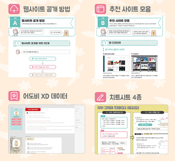 ‘어도비 XD 데이터’는 이미지 잘라내기나 색상 추출 등 연습용으로 사용하고 디자인 파일 제작에 참고할 수 있어요. 가장 유용했던 부록 ‘치트시트’는 학습할 때뿐 아니라 앞으로 웹사이트를 만들고 관리할 때 두고두고 참고할 수 있습니다. 웹사이트 제작을 처음부터 배우고 싶은 초보자, 웹 디자이너가 되고 싶은 분들께 강력히 추천합니다!