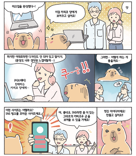 책을 펼치면 귀여운 카피바라 캐릭터 ‘카피조우’가 우리를 반겨요. 카피조우는 카피코에게 데이트 신청을 하기 위해 SNS 링크 모음 사이트를 만들고, 당근 농장 홍보를 위해 업무용 블로그 사이트를 만듭니다. 카피코와 결혼하기로 한 카피조우는 웹 초대장 사이트도 만들고, 레스토랑을 차려 레스토랑 사이트도 만들어요. 카피조우의 삶을 따라가다 보면 나만의 멋진 웹사이트를 4종류나 만들 수 있게 됩니다.