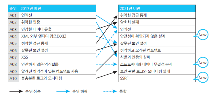 OWASP Top10은 웹 애플리케이션의 중요한 리스크 열 가지를 정리한 순위예요. OWASP Top10은 여러 해에 걸쳐 업데이트되고 있어요. 최신 버전인 2021년 버전에서는 '안전성이 확인되지 않은 설계', '소프트웨어와 데이터 무결성 문제', 'SSRF(server-side request forgery)'가 새롭게 업데이트되었어요. 2017년에는 존재했지만 2021년에는 없는 항목도 있는데, 이는 시대가 변하면서 발생 빈도가 줄어들어 순위가 하락하거나 다른 항목과 합쳐진 경우예요.