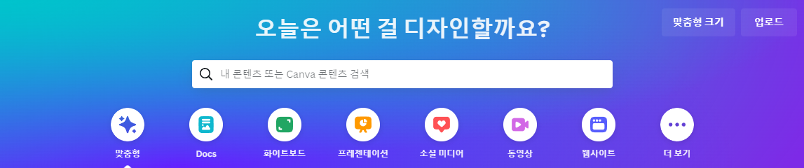 콘텐츠 제작만 될까요? 그렇지 않습니다. 캔바에 가입하고 실행해 보면 가장 먼저 눈에 띄는 문구가 바로 '오늘은 어떤 걸 디자인할까요?'입니다. 일반 문서 작성부터 프레젠테이션을 위한 슬라이드 제작, 소셜 미디어 운영을 위한 콘텐츠 제작, 동영상 편집, 웹사이트 제작 등 거의 모든 작업을 캔바 하나로 끝낼 수 있습니다.