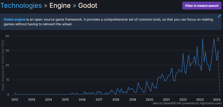 3.x 버전까지는 단점이 꽤 있었지만, 4.0 버전에서 단점을 보완하고 엄청난 성장을 했습니다. 그 결과, 스팀에 출시된 게임 중 고도 엔진을 사용한 게임이 이렇게나 늘었습니다(고도 엔진을 사용한 상위 1000개의 게임은 여기서 보실 수 있어요).