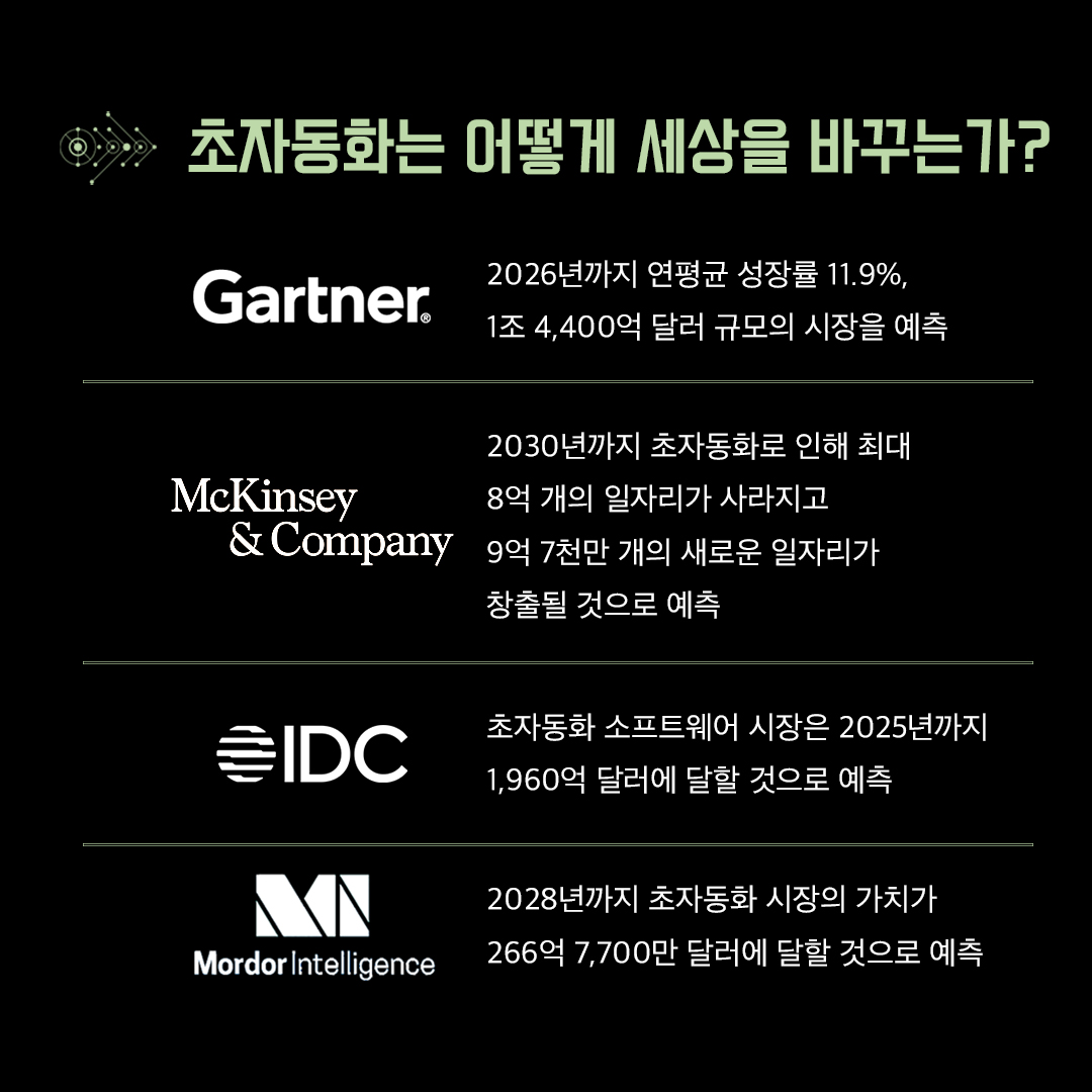 모든 부문에서 인간의 개입은 최소화하면서 자동화할 수 있는 건 모두 자동화하기 시작했습니다. 이를 가트너(Gartner)에서는 '초자동화'라고 정의해서 2020년 10대 기술 트렌드로 선정했고, 실제로 많은 기업에서 초자동화를 채택했습니다. 그렇다면 인간이 설 자리는 없어지는 걸까요? 여기서 중요한 건 초자동화 도입에서 인간을 배제하는 것이 아니라는 점입니다. 기존의 낡은 시스템과 구조는 버리면서도 사람이 주도권을 가져야 합니다. 새로운 기술을 도입할 때는 혼란스러운 것이 당연합니다. 2009년 우버가 시장에 진입했을 때만 해도 부정적인 시각과 우려가 있었습니다. 하지만 기존의 모든 대중교통 모델에 큰 지각 변동을 일으켰고, 큰 성공을 거뒀죠.