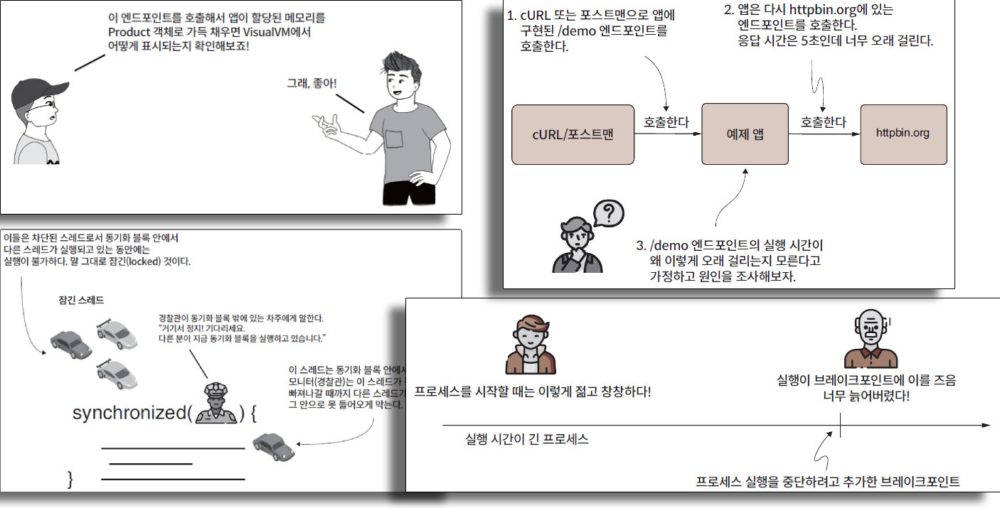JVM의 작동 원리, 자바 스레드 덤프/힙 덤프 등 다소 고급 주제까지 다루는 만큼 내용이 딱딱하게 다가올 수 있는데, 저자는 이를 완화하려는 듯 만화풍의 이미지들을 중간중간 삽입했습니다. 그게 효과가 있었는지는… 음… 독자 여러분의 판단에 맡기겠습니다. 아무튼 노력이라도 했으니 저자의 배려를 부디 즐겨주세요. 🥲