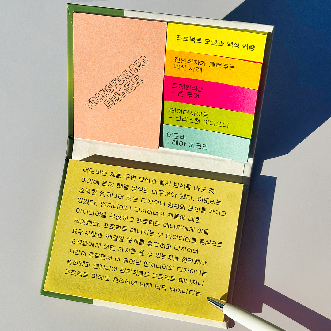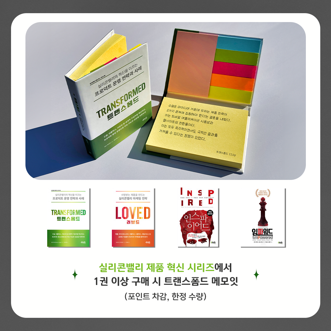 또한, 시리즈 런칭을 기념하여 온라인 서점(교보문고, 예스24, 알라딘)에서 시리즈 중 1권 이상 구매 시, 2025년 업무 관리를 도와줄 트랜스폼드 메모잇을 드립니다. 실용적인 메모잇과 함께 글로벌 리더들이 찾는 최고의 제품 관리 노하우를 확인해 보세요.