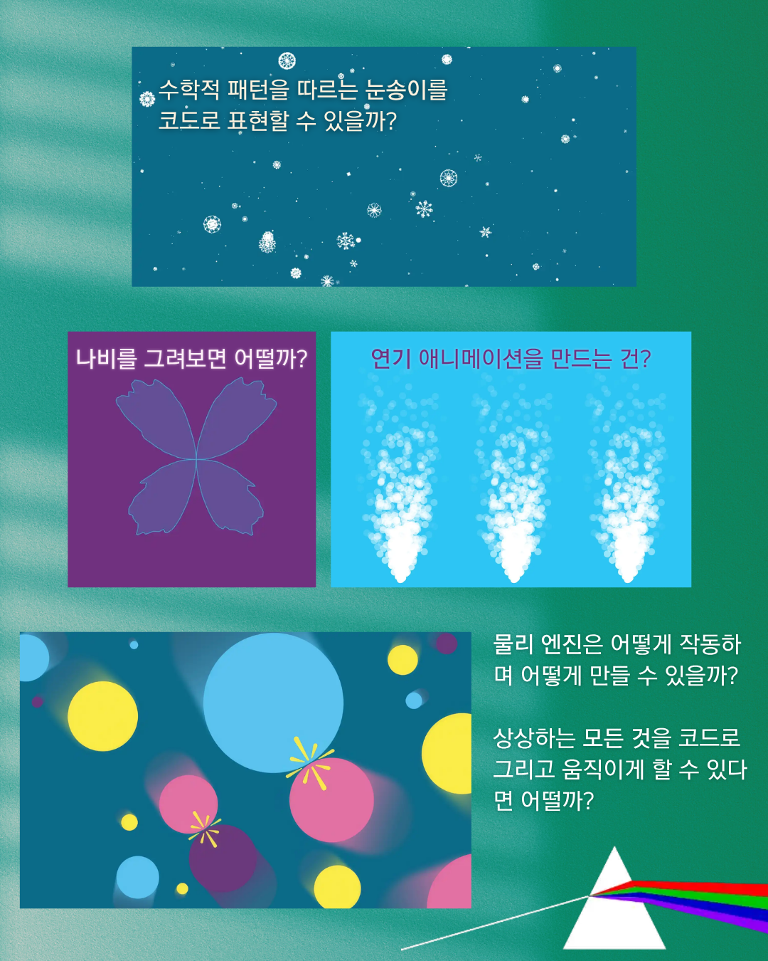 우리는 왜 코딩을 할까요? 그저 먹고살기 위해서인가요??? ㅠㅠ 처음 코딩을 했던 순간을 떠올려봅시다. 혹시 단순히 뭔가 재미있는 걸 만들고 싶었던 건 아니었나요? 별 그리기, 가위바위보, 숫자 야구 이런 걸 만드는 과정에서, 코드로 돌아가는 무언가를 만든다는 행위 자체에 매료되지는 않았나요? 혹시 시각적으로 그럴듯한 걸 만들어서 누군가에게 보여주고 싶었던 건 아니었나요?