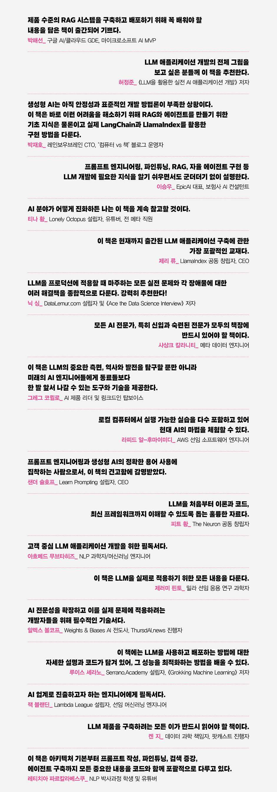 출간 전부터 이 책은 많은 주목을 받았습니다. 추천사가 반드시 책의 가치를 보증하는 건 아니지만, 이번만큼은 예외일지도 모릅니다. "AI 업계로 진출하고자 하는 엔지니어에게 필독서", “AI 분야가 어떻게 진화하든, 나는 이 책을 계속 참고할 것이다”, "LLM을 처음부터 이론과 코드, 최신 프레임워크까지 이해할 수 있도록 돕는 훌륭한 자료" 등의 평가가 엔지니어, 연구자, 입문자를 가리지 않고 이어졌으니까요.