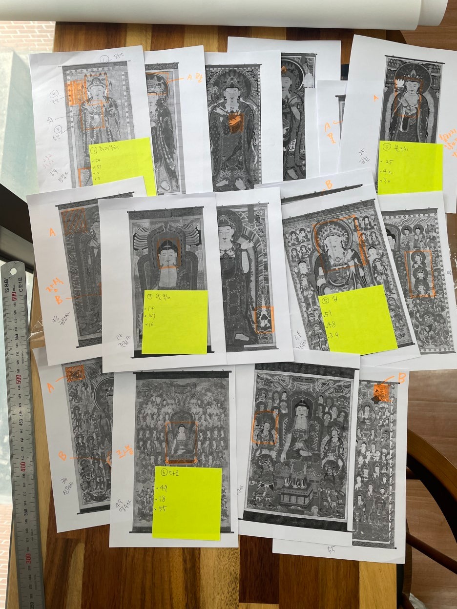 각 작품마다 컬러링으로 어필하고자 하는 부분을 3곳씩 마킹했습니다. 여기까지도 많은 시간이 걸렸지만 1교가 진행 중이던 지난 3월, 보물(1997년)로 지정되었던 <부여 무량사 미륵불 괘불도>가 '국보'로 승격되었다는 경사스러운 소식이 전해졌어요! 1915년에 촬영한 유리건판 사진이 남아 있는데요, 일제강점기를 버텨낸 14미터에 이르는 미륵불의 위엄이 느껴집니다. 이런 작품을 《우리가 사랑한 괘불탱》에서는 고화질(32쪽)로 감상하실 수 있다는 점! 기억해 주세요.