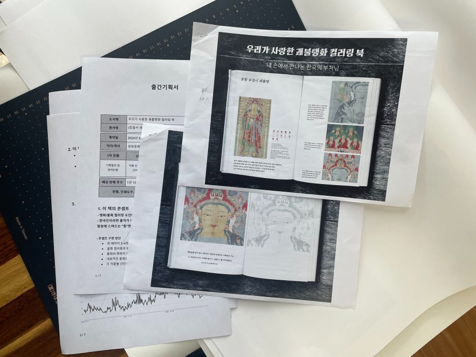 저자인 성보문화유산연구원은 국가유산청의 지원을 받아 2015년부터 대형불화 보존 연구와 동시에 《대형불화 정밀조사 보고서》를 만들어 왔어요. 덕분에 출판에 대한 높은 이해로 협의가 착착 진행되었습니다. 2024년 여름에 시작된 이 프로젝트... 괘불탱 연구를 위해 전국 각지를 다녀야 하는 연구원 여러분이 도서 집필까지 동시에 진행하기는 쉽지 않은 여정이었지요. 그럼에도 열정적으로 집필해 주시고 기획에 대한 의지를 불어넣어 주셔서 편집 작업하는 동안 연구원 저자분의 든든한 응원 덕분에 힘이 났습니다.