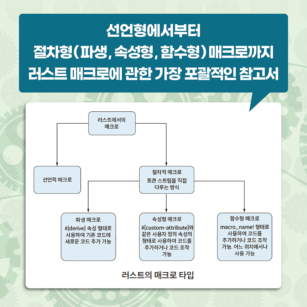 그러나 당연하게도 “Hello, World!”만으로는 만족할 수 없을 테고, 적어도 중급 러스트 프로그래머가 되고자 한다면 러스트의 핵심 무기인 매크로를 제대로 다룰 줄 알아야 합니다. 이제 러스트의 반복적인 패턴들을 자동화하는 매크로 자체로 코드를 만들어내는 마법 같은 느낌을 전달해주는 책이 출간됩니다.